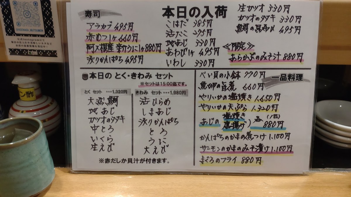 In conclusion, the menu at Shigenaga Mutsumon offers a well-rounded and satisfying showcase of fresh seafood and traditional Japanese flavors, leaving a strong impression through both quality and variety. Standout selections such as the きわみセット provide an excellent introduction to the restaurant’s craftsmanship, while fresh items like 生カツオ, しまあじ, and ウニ highlight the quality of the seafood. The sushi selection is equally appealing, with favorites like にぎり鮨, 鉄火巻き ねぎとろ巻き サラダ巻き, ネギトロ巻き, 納豆巻, and かっぱ巻き offering a good balance of classic and comforting flavors. Side dishes such as 茶碗蒸し and 赤だし complement the meal nicely, and more substantial dishes like 刺し盛り, お刺身盛合せ, 天ぷら 盛り合わせ, 鯛のあら炊き, and 煮穴子 add depth to the dining experience. For those looking to take the experience home, 寿司折c is also a convenient option. Overall, the menu reflects careful preparation, fresh ingredients, and a thoughtful selection that makes the restaurant a memorable destination for sushi and traditional Japanese cuisine.
